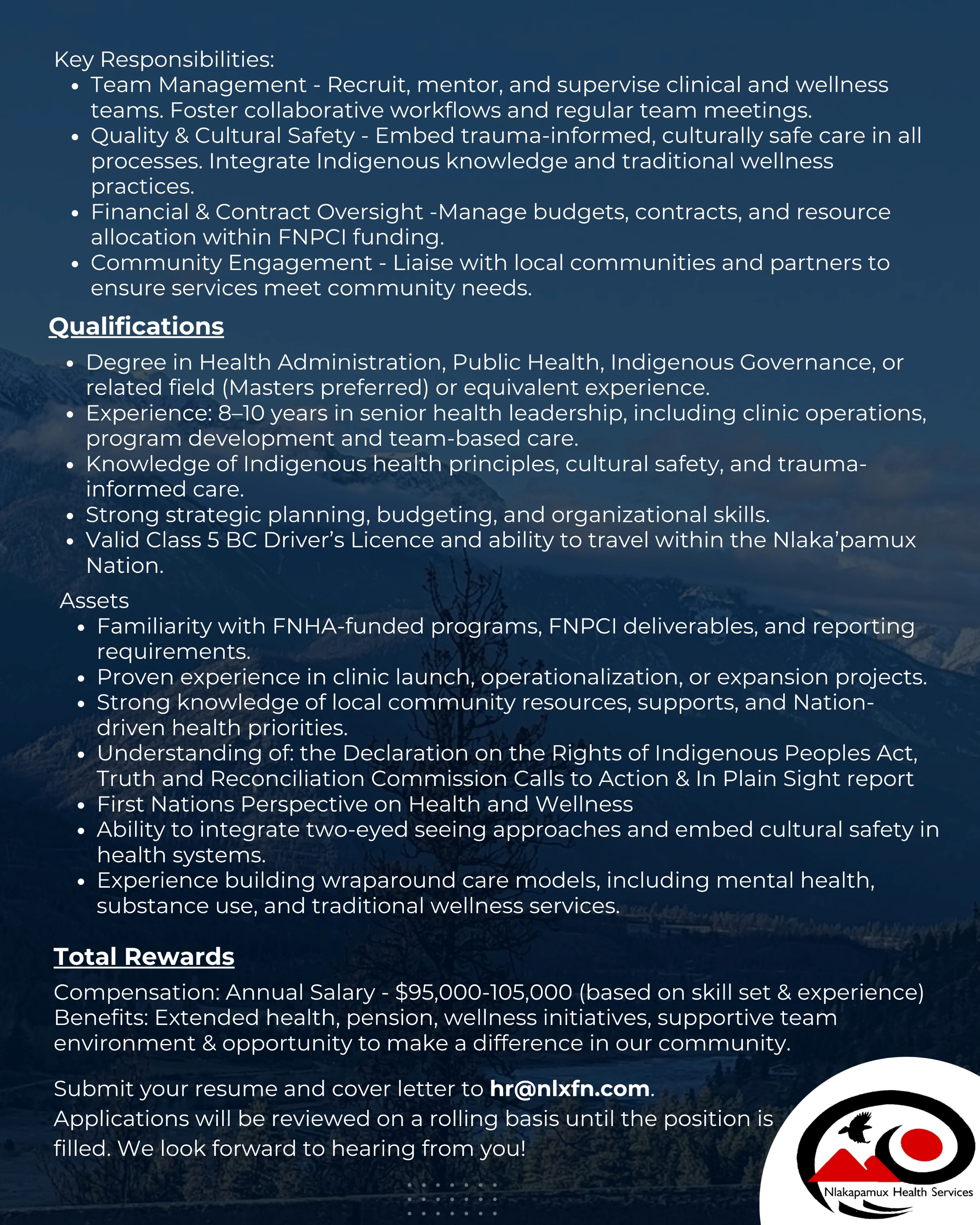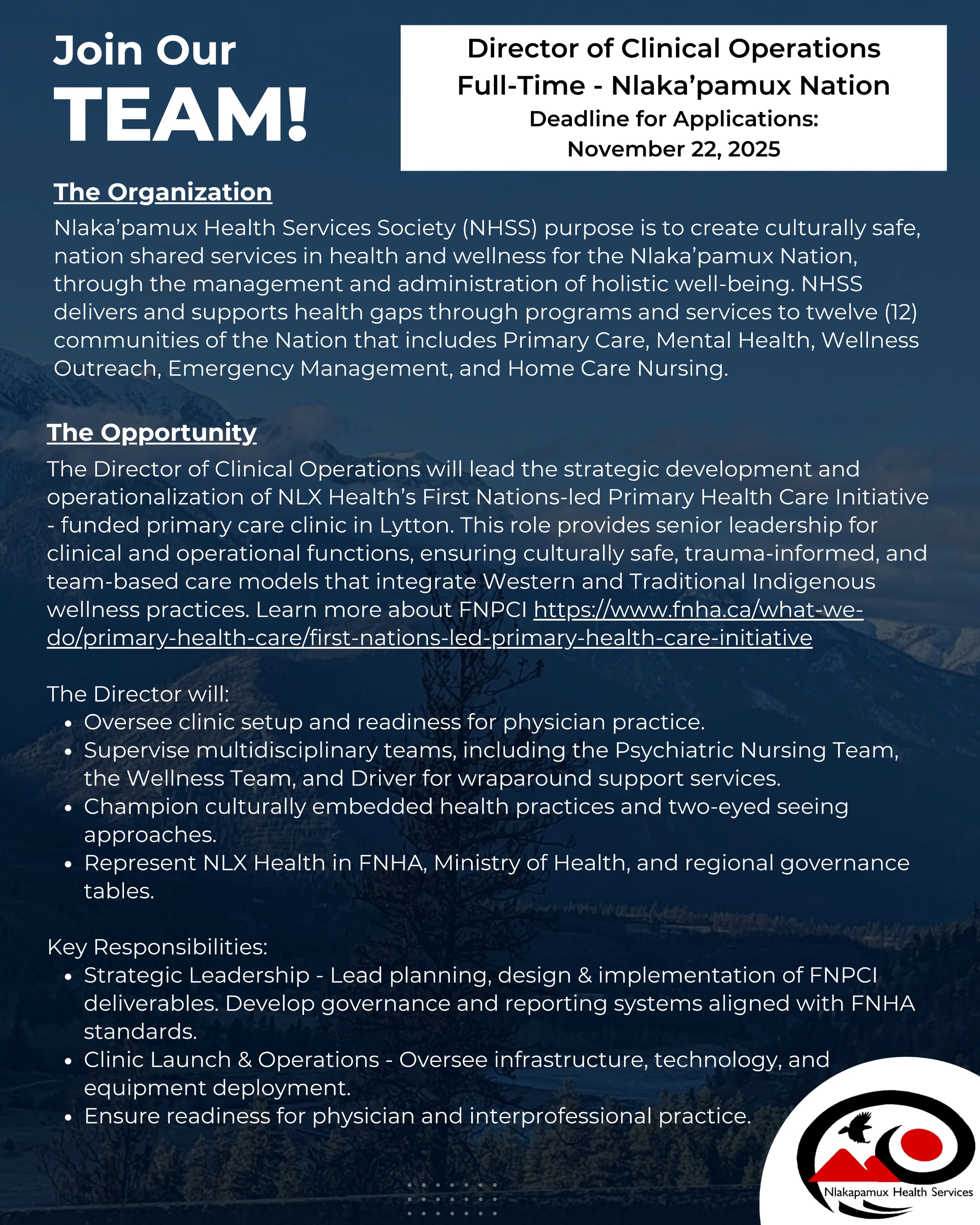 At Nlaka’pamux Health Services, we are dedicated to improving health outcomes and delivering exceptional care to the communities we serve. We are looking for a Director of Clinical Operations!