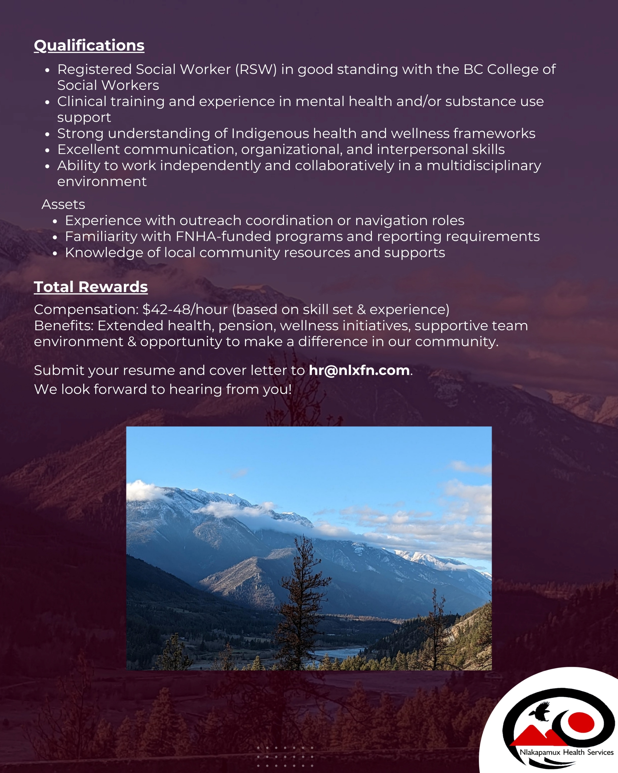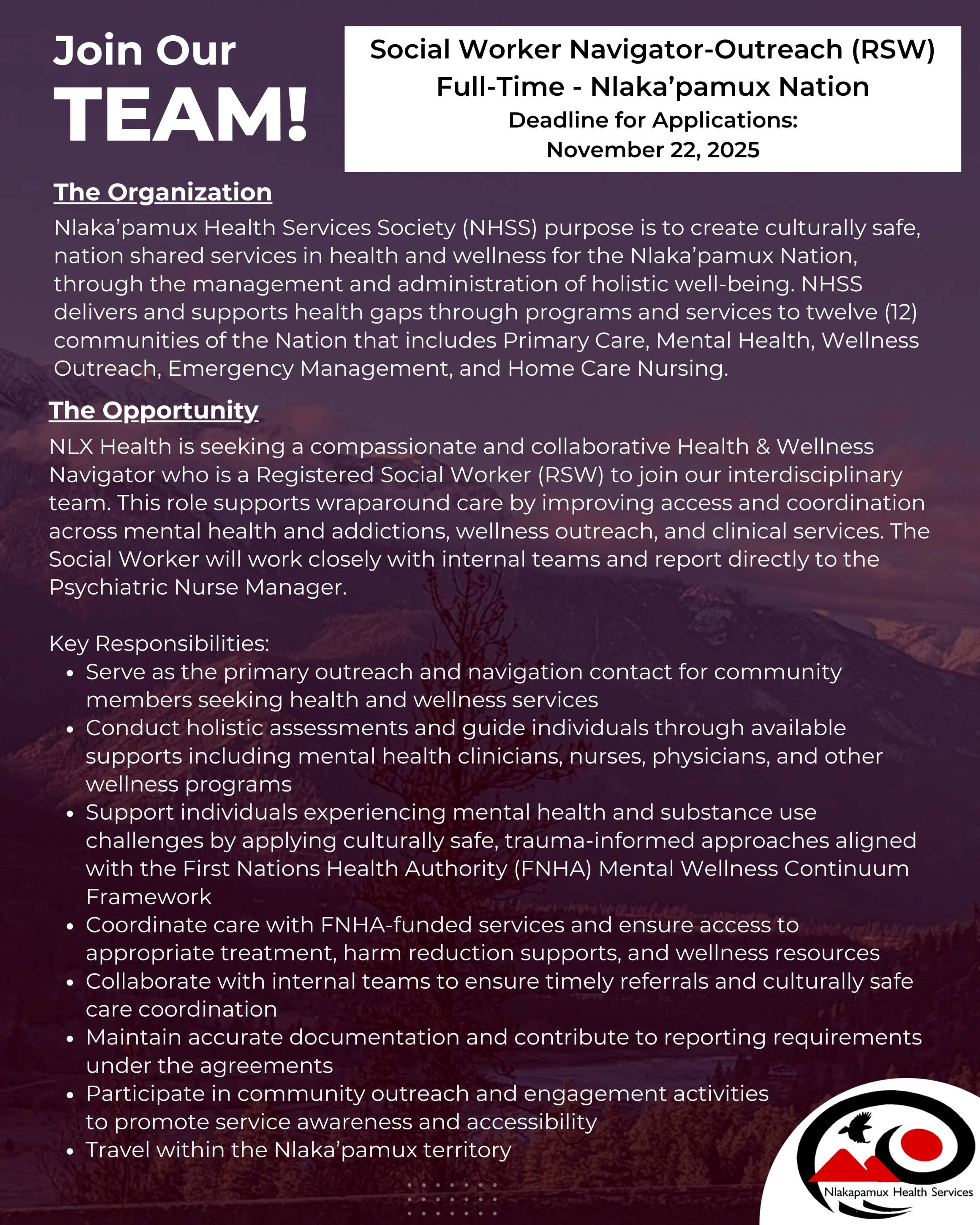 Nlaka’pamux Health Services are looking for a Social Worker Navigator-Outreach (RSW)! This role will support wraparound care by improving access and coordination across mental health and addictions, wellness outreach, and clinical services for the communities we serve.